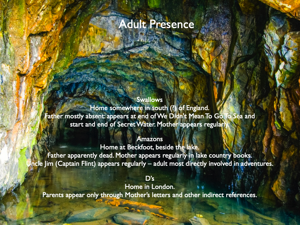 In Coot Club, the D’s sail with the kindly Mrs Barrable, referred to as The Admiral, but much responsibility falls on the shoulders of Tom Dudgeon, who seems to be be about 12 or 13. In The Big Six they conduct the investigation themselves. The vital central passage of We Didn’t Mean to go to Sea has no adult presence at all, and the Swallows are once again left largely to their own devices in Secret Water, albeit trying to fulfill a mapping assignment set by their father. However, we can still say that in general the East Anglian books show greater integration between the adult world and the children’s activities. It’s in the Lake District books that the youngsters seem to be most fully in charge of their own affairs.