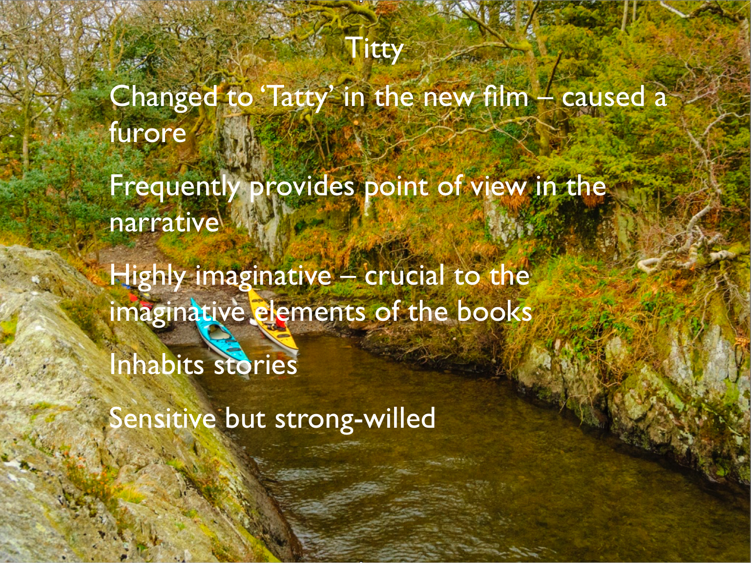 Titty is a sensitive child with a very active imagination and a strong romantic streak – in the true sense of the word. This quality brings colour and excitement to many passages of the books. Titty, more than any of the others – in fact, more than any but a handful of characters in literature – vividly embodies the capacity of the child to inhabit real and imaginary worlds at the same time.