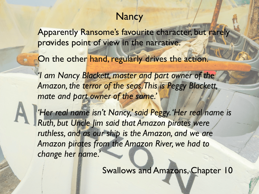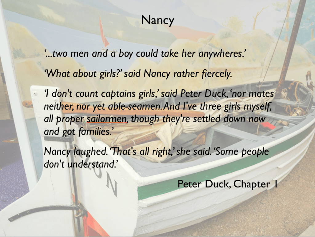 One might argue that, if there is a genuinely ‘submissive’ character in the stories, it’s not Susan but Peggy. However, she’s subordinate not to a male leader but to her own older sister, and with a sister like Nancy it would be well-nigh impossible not to be overshadowed. It’s precisely for this reason that Peggy seems to me the hardest of the eight key characters in the ‘lake country’ books to pin down.